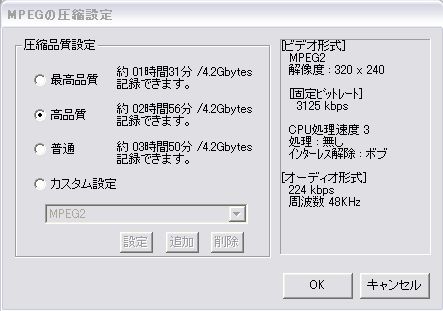 「録画/圧縮形式の設定」でMPEGを選択し、「MPEGの圧縮品質設定」で「高品質」(3125kbps)を選択。